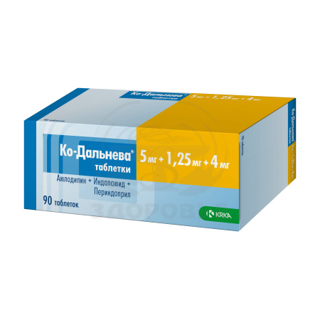 Ко-Дальнева® - комбинированный препарат, содержащий периндоприла эрбумин (ингибитор ангиотензинпревращающего фермента (А11Ф)), индапамид (тиазидоподобный диуретик) и амлодипин (блокатор "медленных" кальциевых каналов (ВМКК)). Ко-Дальнева® сочетает в себе свойства каждого из действующих веществ, которые обладают при этом потенцирующим действием. Фармакодинамика Амлодипин Амлодипин - БМКК, производное дигидропиридина. Амлодипин ингибирует трансмембранный переход ионов кальция в кардиомиоциты и гладкомышечные клетки сосудистой стенки. Антигипертензивное действие амлодипина обусловлено прямым расслабляющим эффектом на гладкомышечные клетки сосудистой стенки. Механизм антиангинального действия амлодипина до конца не изучен, предположительно он связан со следующими эффектами: - вызывает расширение периферических артериол, снижая общее периферическое сосудистое сопротивление (ОПСС) - постнагрузку, что приводит к уменьшению потребности миокарда в кислороде, - вызывает расширение коронарных артерий и артериол как в интактных, так и в ишемизированных участках миокарда, что увеличивает поступление кислорода в миокард, в том числе у пациентов со стенокардией Принцметала. У пациентов с артериальной гипертензией (АГ) прием амлодипина 1 раз в сутки обеспечивает клинически значимое снижение артериального давления (АД) (в положении "лежа" и "стоя") в течение 24 часов. Антигипертензивное действие развивается медленно, в связи с чем, развитие острой артериальной гипотензии нехарактерно. У пациентов со стенокардией прием амлодипина 1 раз в сутки повышает толерантность к физической нагрузке, время до развития приступа стенокардии и до "ишемической" депрессии сегмента ST, снижает частоту приступов стенокардии и потребность в приеме нитроглицерина (короткодействующие формы). Амлодипин не оказывает влияния на показатели липидного профиля и не вызывает изменения гиполипидемических показателей плазмы крови. Препарат может применяться у пациентов с бронхиальной астмой (БА), сахарным диабетом (СД) и подагрой. Индапамид Индапамид является производным сульфонамида. По фармакологическим свойствам близок к тиазидным диуретикам. Индапамид ингибирует реабсорбцию ионов натрия в кортикальном сегменте петли Генле, что приводит к увеличению экскреции почками ионов натрия и хлора, и в меньшей степени ионов калия и магния, усиливая тем самым диурез и снижая АД. В режиме монотерапии антигипертензивное действие сохраняется в течение 24 часов и проявляется при применении препарата в дозах, оказывающих минимальное диуретическое действие. Антигипертензивное действие индапамида связано е улучшением эластических свойств крупных артерий, уменьшением ОПСС. На фоне приема индапамида уменьшается гипертрофия левого желудочка (ГЛЖ). Индапамид не влияет на концентрацию липидов в плазме крови (триглицеридов, общего холестерина, липопротеинов низкой и высокой плотности), на показатели углеводного обмена (в том числе у пациентов с СД). Периндоприл Периндоприл - ингибитор ангиотензинпревращающего фермента. АПФ, или кининаза II, является экзопептидазой, которая превращает ангиотензин I в сосудосуживающее вещество - ангиотензин II, а также разрушает брадикинин, обладающий сосудорасширяющими свойствами, до неактивного гептапептида. В результате периндоп