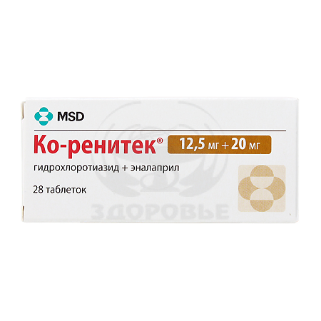 Комбинированный антигипертензивный препарат, в состав которого входят ингибитор АПФ (эналаприла малеат) и тиазидный диуретик (гидрохлоротиазид). Оказывает антигипертензивное и диуретическое действие.Эналаприл – ингибитор АПФ, катализирующего превращение ангиотензина I в прессорную субстанцию ангиотензин II. После всасывания эналаприл превращается путем гидролиза в эналаприлат, который ингибирует АПФ. Ингибирование АПФ приводит к снижению концентрации ангиотензина II в плазме крови, что влечет за собой увеличение активности ренина плазмы крови (вследствие устранения обратной отрицательной реакции на изменение продукции ренина) и уменьшение секреции альдостерона.АПФ идентичен ферменту кининаза II, поэтому эналаприл также может блокировать разрушение брадикинина, пептида, обладающего вазодилатирующим действием. Значение данного механизма в терапевтическом действии эналаприла требует уточнения. Несмотря на то, что эналаприл снижает АД посредством подавления ренин-ангиотензин-альдостероновой системы, которая играет важную роль в регуляции АД, препарат снижает АД даже у пациентов с артериальной гипертензией с низким содержанием ренина.Снижение АД сопровождается снижением ОПСС, небольшим увеличением сердечного выброса и отсутствием изменений или незначительными изменениями ЧСС. В результате приема эналаприла увеличивается почечный кровоток, скорость клубочковой фильтрации остается неизмененной. Однако у пациентов с исходно сниженной клубочковой фильтрацией ее скорость обычно повышается.Антигипертензивная терапия эналаприлом ведет к значительной регрессии гипертрофии левого желудочка и сохранению систолической функции левого желудочка.Терапия эналаприлом сопровождается благоприятным воздействием на соотношение фракций липопротеинов и отсутствием влияния или благоприятным действием на содержание общего холестерина.Прием эналаприла пациентами с артериальной гипертензией приводит к снижению АД как положении стоя, так и в положении лежа без значимого увеличения ЧСС.Симптоматическая постуральная гипотензия развивается редко. У некоторых пациентов достижение оптимального снижения АД может потребовать нескольких недель терапии. Прерывание терапии эналаприлом не вызывает резкого подъема АД.Эффективное ингибирование активности АПФ обычно развивается через 2-4 ч после однократного приема дозы эналаприла внутрь. Начало антигипертензивного действия наступает в течение 1 ч, максимальное снижение АД наблюдается через 4-6 ч после приема препарата. Продолжительность действия зависит от дозы. Однако при применении в рекомендованных дозах антигипертензивное действие и гемодинамические эффекты сохраняются в течение 24 ч.Гидрохлоротиазид оказывает диуретическое и антигипертензивное действие, увеличивает активность ренина. Хотя эналаприл сам по себе проявляет антигипертензивное действие даже у пациентов с артериальной гипертензией на фоне низкой концентрации ренина, сопутствующее применение гидрохлоротиазида у таких пациентов ведет к более выраженному снижению АД.Эналаприл уменьшает потерю ионов калия, вызываемую применением гидрохлоротиазида. Эналаприл и гидрохлоротиазид имеют сходный режим дозирования. Поэтому Ко-ренитек представляет собой удобную лекарственную форму для совместного