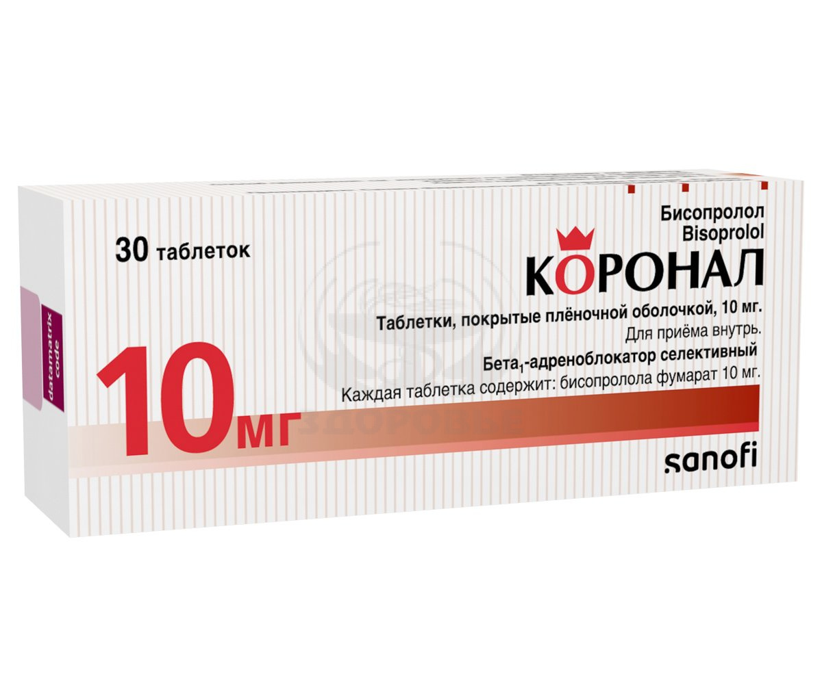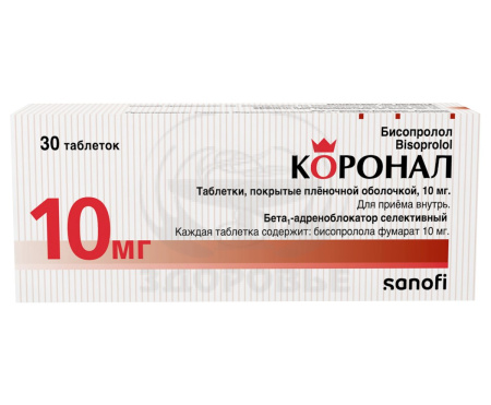 Аллергены, используемые для иммунотерапии, или экстракты аллергенов для кожных проб повышают риск возникновения тяжелых системных аллергических реакций или анафилаксии у больных, получающих бисопролол.; При одновременном применении с Короналом йодосодержащие рентгеноконтрастные лекарственные средства для в/в введения повышают риск развития анафилактических реакций.; При одновременном применении с Короналом фенитоин для в/в введения, лекарственные средства для ингаляционной общей анестезии (производные углеводородов) повышают выраженность кардиодепрессивного действия и вероятность снижения АД.; При одновременном применении Коронал изменяет эффективность инсулина и пероральных гипогликемических лекарственных средств, маскирует симптомы развивающейся гипогликемии (тахикардию, повышение АД).; При одновременном применении Коронал снижает клиренс лидокаина и ксантинов (кроме дифиллина) и повышает их концентрацию в плазме, особенно у больных с исходно повышенным клиренсом теофиллина под влиянием курения.; НПВС (за счет задержки ионов натрия и блокады синтеза простагландина почками), ГКС и эстрогены (за счет задержки ионов натрия) ослабляют антигипертензивный эффект Коронала.; При одновременном применении с Короналом сердечные гликозиды, метилдопа, резерпин и гуанфацин, блокаторы медленных кальциевых каналов (верапамил, дилтиазем), амиодарон и другие антиаритмические лекарственные средства повышают риск развития или усугубления брадикардии, AV-блокады, остановки сердца и сердечной недостаточности.; При одновременном применении с Короналом нифедипин может приводить к значительному снижению АД.; При одновременном применении с Короналом диуретики, клонидин, симпатолитики, гидралазин и другие гипотензивные лекарственные средства могут привести к чрезмерному снижению АД.; Коронал удлиняет действие недеполяризующих миорелаксантов и антикоагулянтный эффект кумаринов.; При одновременном применении с Короналом трициклические и тетрациклические антидепрессанты, антипсихотические лекарственные средства (нейролептики), этанол, седативные и снотворные лекарственные средства усиливают угнетение ЦНС, могут провоцировать нарушения сердечного ритма, брадикардию и ортостатическую гипотензию.; Не рекомендуется одновременное применение Коронала с ингибиторами МАО вследствие значительного усиления гипотензивного действия, перерыв в лечении между приемом ингибиторов МАО и Коронала должен составлять не менее 14 дней.; При одновременном применении с Короналом негидрированные алкалоиды спорыньи, эрготамин повышают риск развития нарушений периферического кровообращения.; При одновременном применении с Короналом сульфасалазин повышает концентрацию бисопролола в плазме.; При одновременном применении с Короналом рифампицин укорачивает Т1/2 бисопролола.; Существует потенциальная опасность аддитивного эффекта с развитием гипотензии и/или значительной брадикардии, при совместном использовании с бета-адреноблокаторами для местного применения (глазные капли).; Отмечается снижение антигипертензивного действия препарата на фоне применения адреналина и норадреналина.; Вероятность нарушений автоматизма, проводимости и сократимости сердца увеличивается (взаимно) на фоне терапии хинидиновыми препаратами (мефло