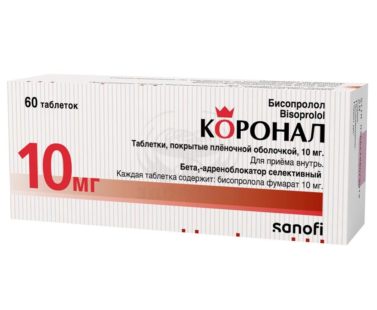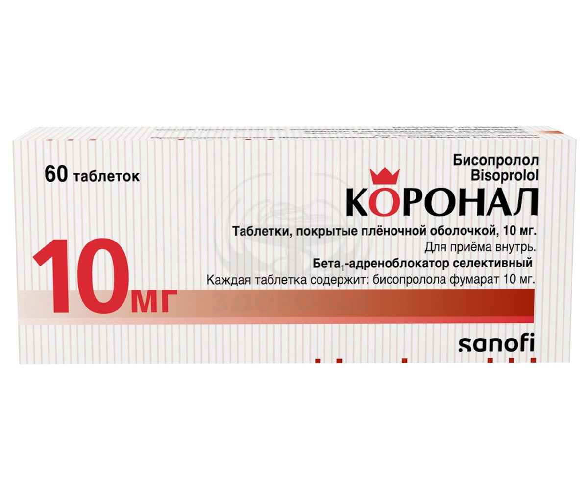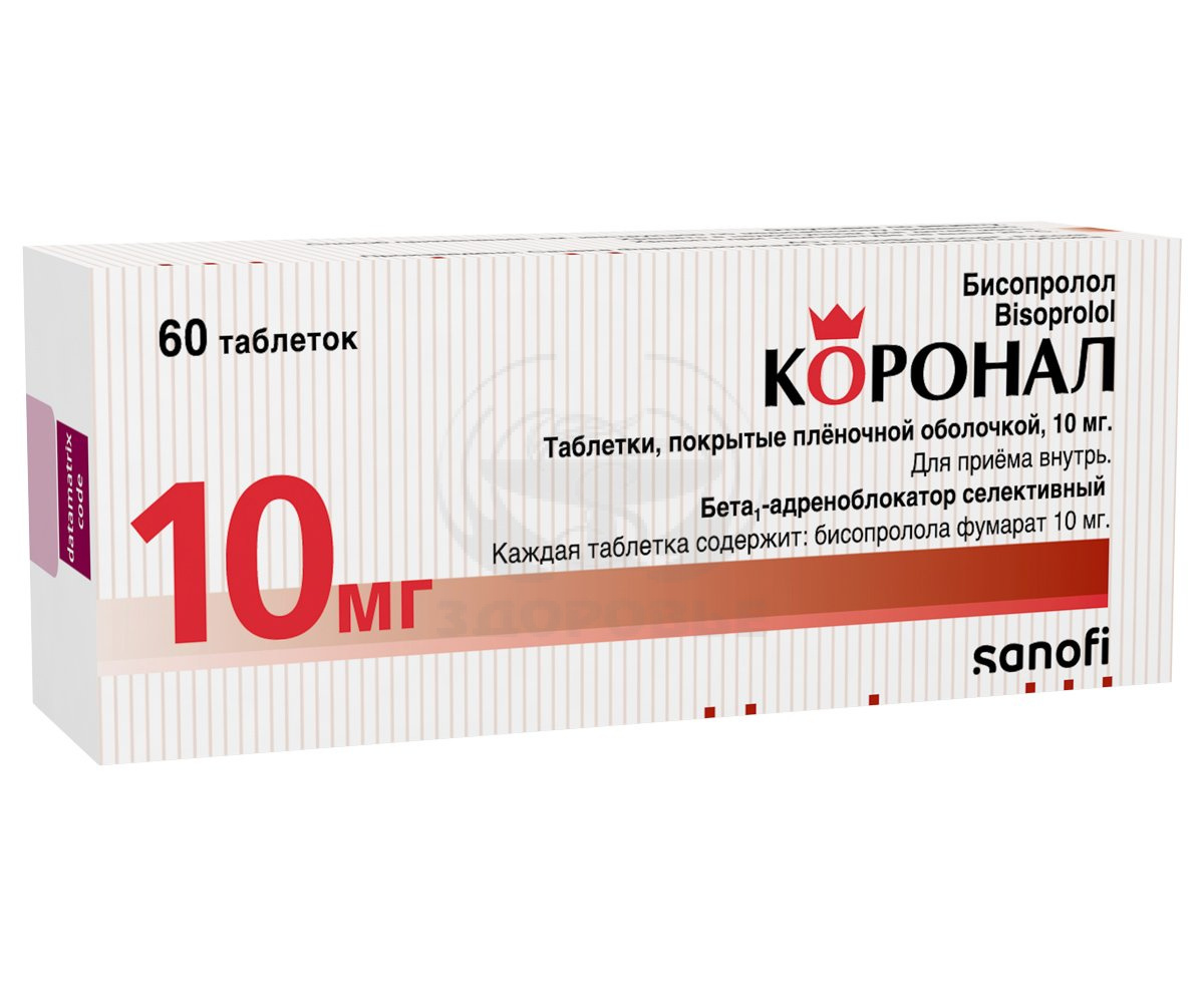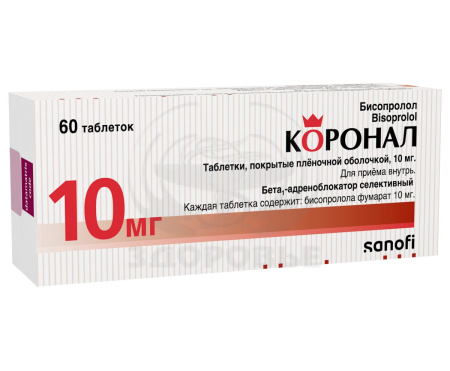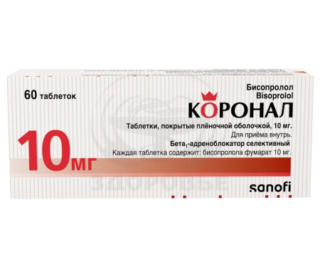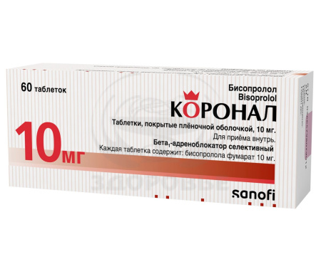 Аллергены, используемые для иммунотерапии, или экстракты аллергенов для кожных проб повышают риск возникновения тяжелых системных аллергических реакций или анафилаксии у больных, получающих бисопролол.;При одновременном применении с Короналом йодосодержащие рентгеноконтрастные лекарственные средства для в/в введения повышают риск развития анафилактических реакций.;При одновременном применении с Короналом фенитоин для в/в введения, лекарственные средства для ингаляционной общей анестезии (производные углеводородов) повышают выраженность кардиодепрессивного действия и вероятность снижения АД.;При одновременном применении Коронал изменяет эффективность инсулина и пероральных гипогликемических лекарственных средств, маскирует симптомы развивающейся гипогликемии (тахикардию, повышение АД).;При одновременном применении Коронал снижает клиренс лидокаина и ксантинов (кроме дифиллина) и повышает их концентрацию в плазме, особенно у больных с исходно повышенным клиренсом теофиллина под влиянием курения.;НПВС (за счет задержки ионов натрия и блокады синтеза простагландина почками), ГКС и эстрогены (за счет задержки ионов натрия) ослабляют антигипертензивный эффект Коронала.;При одновременном применении с Короналом сердечные гликозиды, метилдопа, резерпин и гуанфацин, блокаторы медленных кальциевых каналов (верапамил, дилтиазем), амиодарон и другие антиаритмические лекарственные средства повышают риск развития или усугубления брадикардии, AV-блокады, остановки сердца и сердечной недостаточности.;При одновременном применении с Короналом нифедипин может приводить к значительному снижению АД.;При одновременном применении с Короналом диуретики, клонидин, симпатолитики, гидралазин и другие гипотензивные лекарственные средства могут привести к чрезмерному снижению АД.;Коронал удлиняет действие недеполяризующих миорелаксантов и антикоагулянтный эффект кумаринов.;При одновременном применении с Короналом трициклические и тетрациклические антидепрессанты, антипсихотические лекарственные средства (нейролептики), этанол, седативные и снотворные лекарственные средства усиливают угнетение ЦНС, могут провоцировать нарушения сердечного ритма, брадикардию и ортостатическую гипотензию.;Не рекомендуется одновременное применение Коронала с ингибиторами МАО вследствие значительного усиления гипотензивного действия, перерыв в лечении между приемом ингибиторов МАО и Коронала должен составлять не менее 14 дней.;При одновременном применении с Короналом негидрированные алкалоиды спорыньи, эрготамин повышают риск развития нарушений периферического кровообращения.;При одновременном применении с Короналом сульфасалазин повышает концентрацию бисопролола в плазме.;При одновременном применении с Короналом рифампицин укорачивает Т1/2 бисопролола.;Существует потенциальная опасность аддитивного эффекта с развитием гипотензии и/или значительной брадикардии, при совместном использовании с бета-адреноблокаторами для местного применения (глазные капли).;Отмечается снижение антигипертензивного действия препарата на фоне применения адреналина и норадреналина.;Вероятность нарушений автоматизма, проводимости и сократимости сердца увеличивается (взаимно) на фоне терапии хинидиновыми препаратами (мефлохин, хлоро