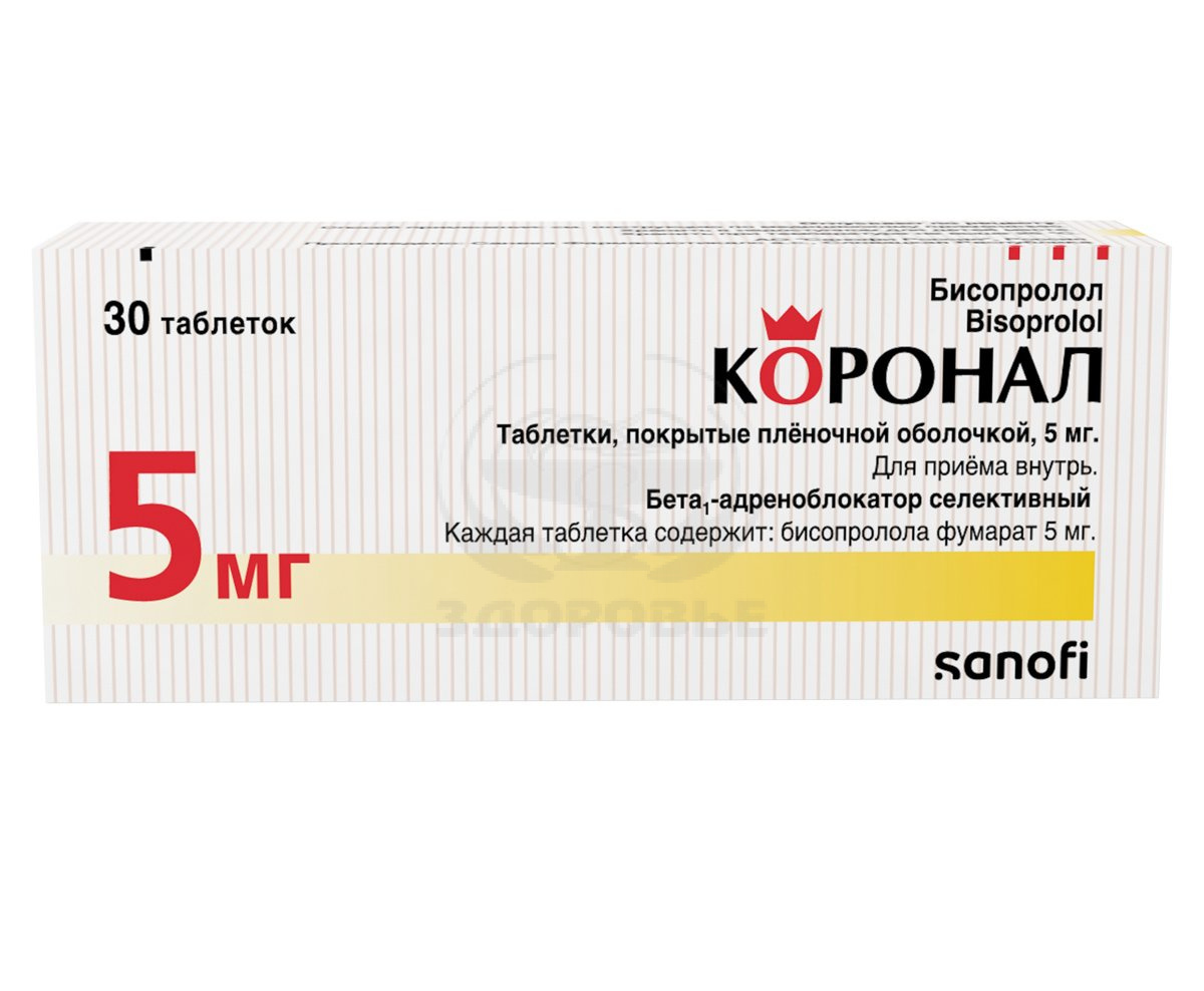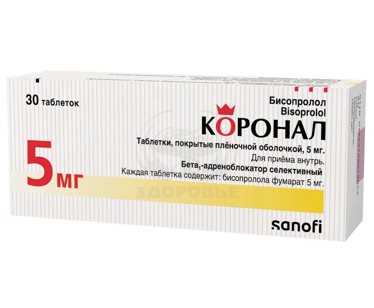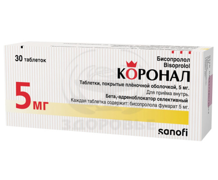 Применение препарата КОРОНАЛ у детей до 18 лет противопоказано, так как эффективность и безопасность не установлены. Контроль за больными, принимающими КОРОНАЛ, должен включать измерение частоты сердечных сокращений и артериального давления (в начале лечения – ежедневно, затем 1 раз в 3-4 мес), проведение электрокардиограммы, определение концентрации глюкозы в крови у больных сахарным диабетом (1 раз в 4-5 мес). У пожилых пациентов рекомендуется следить за функцией почек (1 раз в 4-5 мес). Следует обучить больного методике подсчета частоты сердечных сокращений и проинструктировать о необходимости врачебной консультации при частоте сердечных сокращений менее 50 уд/мин. Перед началом лечения рекомендуется проводить исследование функции внешнего дыхания у больных с отягощенным бронхолегочным анамнезом. Примерно у 20 % больных стенокардией бета-адреноблокаторы неэффективны. Основные причины – тяжелый коронарный атеросклероз с низким порогом ишемии (частота сердечных сокращений менее 100 уд/мин) и повышенный конечный диастолический объем левого желудочка, нарушающий субэндокардиальный кровоток. У «курильщиков» эффективность бета-адреноблокаторов ниже. Больные, пользующиеся контактными линзами, должны учитывать, что на фоне лечения возможно уменьшение продукции слезной жидкости. При применении у больных с феохромоцитомой имеется риск развития парадоксальной артериальной гипертензии (если предварительно не достигнута эффективная альфа- адреноблокада). При тиреотоксикозе бисопролол может замаскировать определенные клинические признаки тиреотоксикоза (например, тахикардию). Резкая отмена у больных с тиреотоксикозом противопоказана, поскольку способна усилить симптоматику. При сахарном диабете может маскировать тахикардию, вызванную гипогликемией. В отличие от неселективных бета-адреноблокаторов практически не усиливает вызванную инсулином гипогликемию и не задерживает восстановление концентрации глюкозы в крови до нормального уровня. При одновременном приеме клонидина его прием может быть прекращен только через несколько дней после отмены препарата КОРОНАЛ. Возможно усиление выраженности реакции повышенной чувствительности и отсутствие эффекта от обычных доз эпинефрина на фоне отягощенного аллергологического анамнеза. В случае необходимости проведения планового хирургического лечения отмену препарата проводят за 48 ч до начала общей анестезии. Если больной принял препарат перед операцией, ему следует подобрать лекарственное средство для общей анестезии с минимальным отрицательным инотропным действием. Реципрокную активацию блуждающего нерва можно устранить внутривенным введением атропина (1-2 мг). Лекарственные средства, снижающие запасы катехоламинов (в том числе, резерпин), могут усилить действие бета-адреноблокаторов, поэтому больные, принимающие такие сочетания лекарственных средств, должны находиться под постоянным наблюдением врача на предмет выявления выраженного понижения артериального давления или брадикардии. Больным с бронхоспастическими заболеваниями можно назначать кардиоселективные бета-адреноблокаторы в случае непереносимости и/или неэффективности других гипотензивных лекарственных средств. Передозировка опасна развитием бронхоспазма. В случае появления у больных пожил