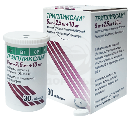 Трипликсам - комбинированный препарат, включающий в себя три антигипертензивных компонента, каждый из которых дополняет действие других по контролю артериального давления у пациентов с артериальной гипертензией. Амлодипин - блокатор "медленных" кальциевых каналов (БМКК), производное дигидропиридина, индапамид - сульфонамидный диуретик, периндоприла аргинин - ингибитор фермента, превращающего ангиотензин I в ангиотензин II (ингибитор АПФ).