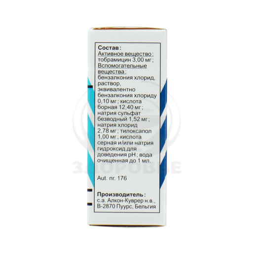 На 1 мл: тобрамицин 3 мг. Вспомогательные вещества: бензалкония хлорид (в виде раствора) - 0.1 мг, борная кислота - 12.4 мг, натрия сульфат безводный - 1.52 мг, натрия хлорид - 2.78 мг, тилоксапол - 1 мг, серная кислота и/или натрия гидроксид (для доведения рН), вода очищенная - до 1 мл.