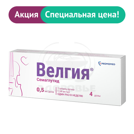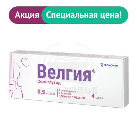 Велгия® – это препарат, содержащий действующее вещество семаглутид, который назначается в качестве дополнения к низкокалорийной диете и физической активности для коррекции и контроля массы тела. Семаглутид относится к средствам для лечения сахарного диабета; гипогликемическим средствам, кроме инсулинов. Семаглутид является аналогом природного гормона – глюкагоноподобного пептида-1 (ГПП-1), который выделяется после приема пищи и служит физиологическим регулятором углеводного обмена (уровня инсулина и глюкозы), а также аппетита и потребления пищи. Семаглутид воздействует на мишени (рецепторы) в головном мозге, которые контролируют аппетит, что помогает Вам быстрее почувствовать себя сытым, сохранить это ощущение надолго и снизить повышенную тягу к приему пищи. Также семаглутид затормаживает эвакуацию пищи из желудка, что дополнительно поддерживает длительное ощущение сытости. Такой механизм поможет Вам привыкнуть к правильному питанию и эффективно снизить массу тела. При приеме семаглутида наблюдаются дополнительные эффекты, такие как уменьшение окружности талии, улучшение обмена веществ (уровня липидов, глюкозы и др.), улучшение параметров сердечно-сосудистой системы (артериальное давление, пульс). Снижение массы тела на фоне приема семаглутида способствует уменьшению риска развития осложнений, связанных с наличием повышенной массы тела, в частности, сердечно-сосудистых заболеваний, сахарного диабета 2 типа (СД2), репродуктивных нарушений, заболеваний суставов, печени и др.