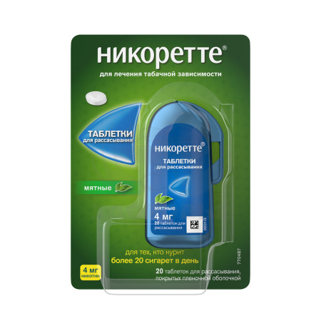Независимо от используемых лекарственных средств, некоторые симптомы, как известно, могут быть обусловлены отменой никотина вследствие прекращения курения. К ним относятся эмоциональные или когнитивные эффекты, такие как дисфория или подавленное настроение, бессонница, раздражительность, недовольство или гневливость, тревога, затруднение концентрации внимания, беспокойство или нетерпеливость. Также могут наблюдаться эффекты, влияющие на физическое состояние человека, такие как снижение частоты сердечных сокращений, повышение аппетита или увеличение массы тела, головокружение или пресинкопальные состояния, кашель, запор, кровоточивость десен, повышение частоты афтозных язв или назофарингита. Кроме того, тяга к никотину, рассматриваемая в качестве клинически значимого симптома – важное проявление отмены никотина после прекращения курения. Большинство нежелательных реакций отмечались в раннюю фазу лечения и носят преимущественно дозозависимый характер. В первые несколько дней лечения может наблюдаться раздражение слизистой оболочки полости рта и глотки, однако продолжение лечения приводит к адаптации. При применении таблеток для рассасывания Никоретте® редко развиваются аллергические реакции (включая анафилактические реакции).Приведенные ниже данные суммируют информацию по профилю безопасности препарата, полученную в ходе его применения в клинической практике. Критерии оценки частоты возникновения побочных эффектов: очень часто (>1/10), часто (> 1/100 и< 1/10), нечасто (> 1/1000 и < 1/100), редко (>1/10000 и < 1/1000), очень редко (< 1/10000, включая отдельные сообщения), неизвестно (оценка на основании имеющихся данных невозможна).Ниже приведены нежелательные реакции, наблюдавшиеся у > 1% пациентов в ходе клинического исследования:Нарушения со стороны пищеварительной системы: очень часто: тошнота*, часто: боль в животе, сухость во рту, диспепсия, метеоризм, гиперсекреция слюны, стоматит, рвота*.Системные нарушения и осложнения в месте введения: часто: чувство жжения**, утомляемость*.Нарушения со стороны иммунной системы: часто: реакции повышенной чувствительности*.Нарушения со стороны нервной системы: очень часто: головная боль*, часто: изменение вкуса, парестезия*.Нарушения со стороны дыхательной системы и органов средостения: очень часто: кашель***, икота, раздражение слизистой оболочки глотки.* Системное действие,** В месте применения,*** Более высокая частота развития реакции наблюдалась в клинических исследованиях никотинсодержащего препарата в форме ингалятора.По данным постмаркетинговых исследований:Нарушения со стороны сердца: нечасто: ощущение сердцебиения*, тахикардия*.Нарушения со стороны органа зрения: неизвестно: нечеткость зрения, усиление слезотечения.Нарушения со стороны пищеварительной системы: часто: диарея, нечасто: отрыжка, глоссит, образование пузырей на слизистой оболочке рта и отслоение слизистой оболочки полости рта, парестезия полости рта, редко: дисфагия, гипестезия полости рта позывы на рвоту, неизвестно: сухость в глотке, желудочно-кишечный дискомфорт*, боль в губах.Системные нарушения и осложнения в месте введения: нечасто: астения*, дискомфорт и боль в грудной клетке*, недомогание*.Нарушения со стороны иммунной системы: неизвестно: анафилактические реакции*.Психические нарушения: нечасто: необычные сн