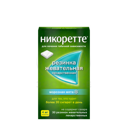 Всасывание: Никотин, поступающий из резинки жевательной, быстро всасывается через слизистую оболочку щеки и обнаруживается в крови через 5-7 мин. Cmax никотина в плазме крови достигается через 30 мин после начала применения жевательной резинки. Распределение: Vd никотина при внутривенно введении составляет около 2-3 л/кг. Связывание никотина с белками плазмы крови составляет менее 5%. В связи с этим нарушения связывания никотина при одновременном применении других препаратов или изменения количества белка в плазме при различных заболеваниях не должны оказывать существенного влияния на кинетику никотина. Метаболизм: Никотин метаболизируется в печени, почках и легких. Идентифицировано более 20 метаболитов, которые уступают по активности никотину. Концентрация первичного метаболита - котинина - превышает концентрацию никотина в 10 раз. Выведение Выводится в основном печенью. Средний плазменный клиренс составляет около 70 л/ч. T1/2 - около 2 ч. С мочой выводятся в основном котинин (15% дозы, T1/2 - 15-20 ч) и транс-3-гидрокси-котинин (45% дозы). 10-30% дозы никотина выводится с мочой в неизмененном виде. Фармакокинетика в особых клинических случаях: Прогрессирующее ухудшение функции почек сопровождается снижением общего клиренса никотина. Фармакокинетика никотина существенно не меняется у больных с циррозом печени с незначительно выраженными нарушениями функции печени (5 баллов по шкале Чайлд-Пью) и снижается у пациентов с циррозом печени с умеренно выраженными нарушениями функции печени (7 баллов по шкале Чайлд-Пью). У пациентов, находящихся на гемодиализе, отмечали повышение концентрации никотина в плазме крови. У пожилых пациентов отмечается небольшое снижение общего клиренса никотина, что не требует коррекции дозы.