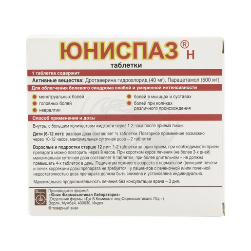 Юниспаз-Н - комбинированный препарат, оказывающий анальгетическое и спазмолитическое действие.;Парацетамол - анальгетик-антипиретик, обладает слабо выраженным противовоспалительным действием, механизм которого связан с ингибированием синтеза простагландинов в ЦНС, и в меньшей степени - путем периферического действия, блокирования простагландинов и других активных веществ, стимулирующих болевые рецепторы.;Дротаверин - производное изохинолина, обладающее спазмолитическим действием в отношении гладкой мускулатуры (ингибирование фермента фосфодиэстеразы IV, увеличение концентрации цАМФ, который инактивируя фермент - миозинкиназу, приводит к расслаблению гладкой мускулатуры сосудов, ЖКТ, желчевыводящих путей а также органов мочеполовой системы.