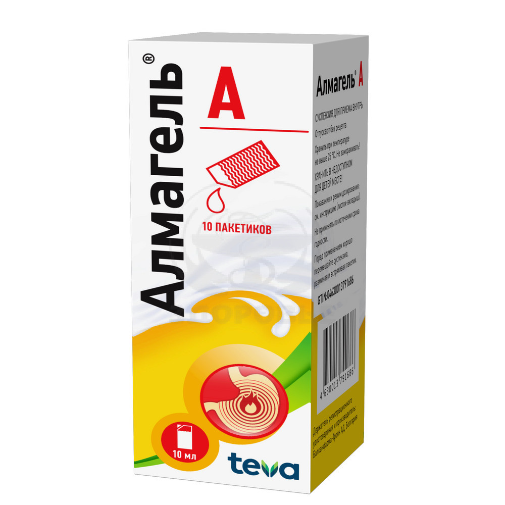 ФармакодинамикаАлмагель® А – лекарственное средство представляющее собой сбалансированную комбинацию алгелдрата (алюминия гидроксида) магния гидроксида и бензокаина. Алмагель® А нейтрализует свободную соляную кислоту в желудке снижает активность пепсина что приводит к уменьшению переваривающей активности желудочного сока. Оказывает обволакивающее адсорбирующее действие. Защищает слизистую оболочку желудка за счет стимулирования синтеза простагландинов (цитопротективное действие). Это предохраняет слизистую оболочку от воспалительных и эрозивно-геморрагических поражений в результате применения раздражающих и ульцерогенных агентов таких как этиловый спирт и нестероидные противовоспалительные препараты (например индометацин диклофенак аспирин ацетилсалициловая кислота кортикостероидные препараты). Терапевтический эффект после приема препарата наступает через 3-5 минут. Продолжительность действия зависит от скорости опорожнения желудка. При приеме натощак действие длится до 60 минут. При приеме через час после приема пищи антацидное действие может продолжаться до 3 часов.Не вызывает вторичную гиперсекрецию желудочного сока.Бензокаин оказывает местное обезболивающее действие при наличии выраженного болевого синдрома.ФармакокинетикаАлгелдратВсасывание – резорбируются небольшие количества препарата которые практически не изменяют концентрацию солей алюминия в крови.Распределение – нет.Метаболизм – нет.Выведение – выводится через кишечник.Магния гидроксидВсасывание – ионы магния резорбируются в около 10% принятой дозы и не изменяют концентрации ионов магния в крови.Распределение – обычно локально.Метаболизм — нет.Выведение — выводится через кишечник.БензокаинБензокаин всасывается в минимальных количествах и практически не оказывает системных эффектов на организм. Его местный обезболивающий эффект наступает через 1-2 минуты после приема суспензии.