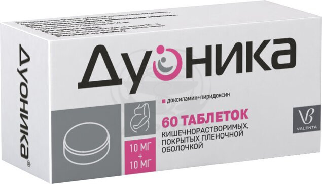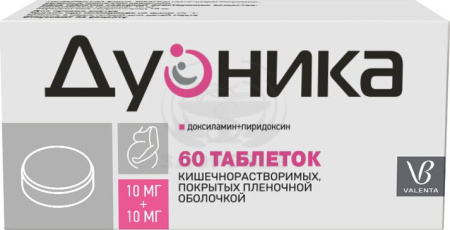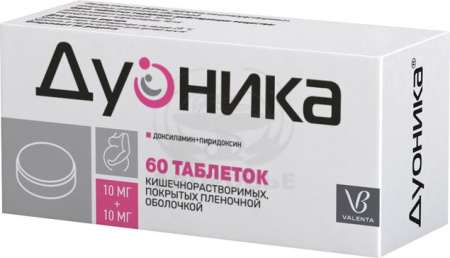Препарат Дуоника® является комбинированным препаратом, содержащим два действующих вещества: доксиламин (в виде сукцината) и пиридоксин (в виде гидрохлорида).