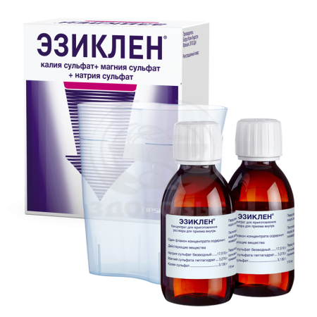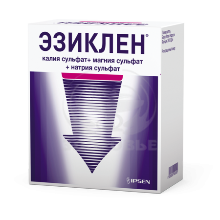 Эзиклен® является осмотическим слабительным средством. Механизм действия препарата в первую очередь обусловлен ограниченным по насыщаемости процессом активного транспорта сульфатов. При достижении порога насыщения всасывания сульфаты остаются в просвете кишечника. Осмотический эффект неабсорбированных сульфатов и прием внутрь значительного объема воды вызывает задержку воды в кишечнике, что обеспечивает слабительное действие, вызывая обильную водянистую диарею, и приводит к очищению кишечника.