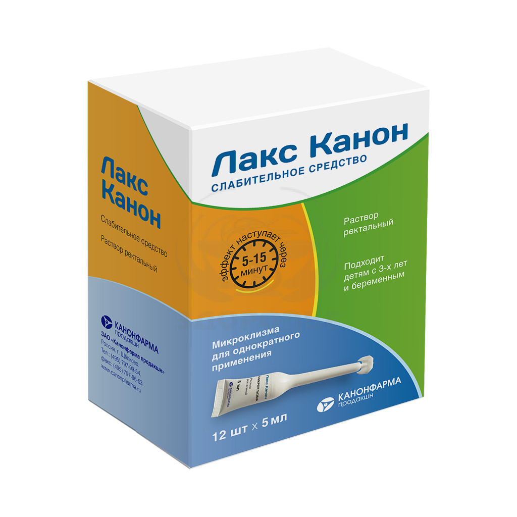 Лакс Канон - комбинированный препарат, оказывающий слабительное действие. Эффект наступает через 5-15 мин. В состав препарата входят натрия цитрат (пептизатор, который вытесняет связанную воду, содержащуюся в каловых массах), натрия лаурилсульфоацетат (разжижает содержимое кишечника) и сорбит (усиливает слабительное действие нулем стимуляции поступления воды в кишечник). Увеличение количества воды за счет пептизации и разжижения способствует размягчению каловых масс и облегчает опорожнение кишечника.