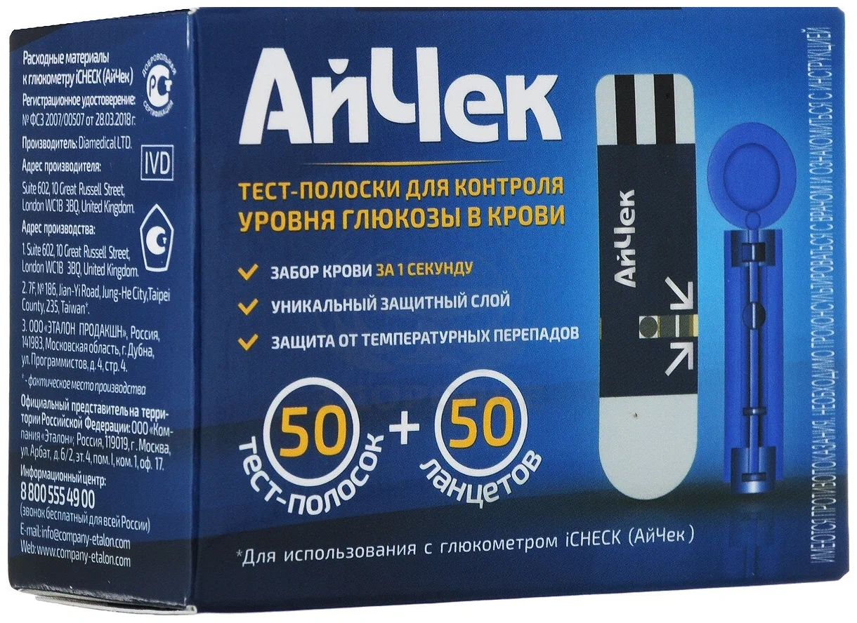 Тест-полоски АйЧек (ICheck) предназначены для использования с глюкометром полоски АйЧек (ICheck для количественного измерения уровня глюкозы в цельной крови.