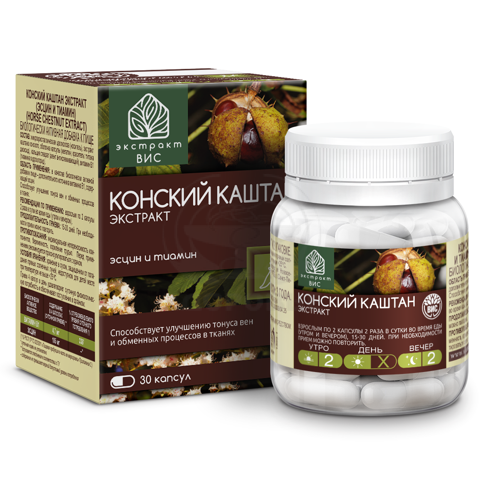Рекомендуемый суточный прием (4 капсулы) "Конский каштан Экстракт-ВИС" содержит биологически активное вещество 105 мг эсцина и 4,7 мг витамина В1.